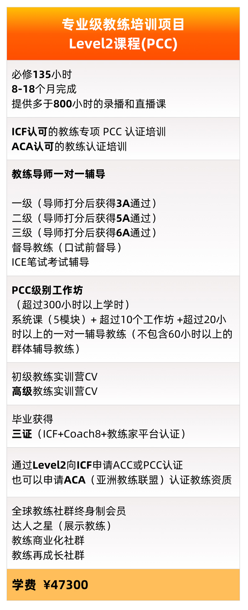 注:所有课程均获得了ICF 认可,不需要先完成level1课程,再学习level2课程